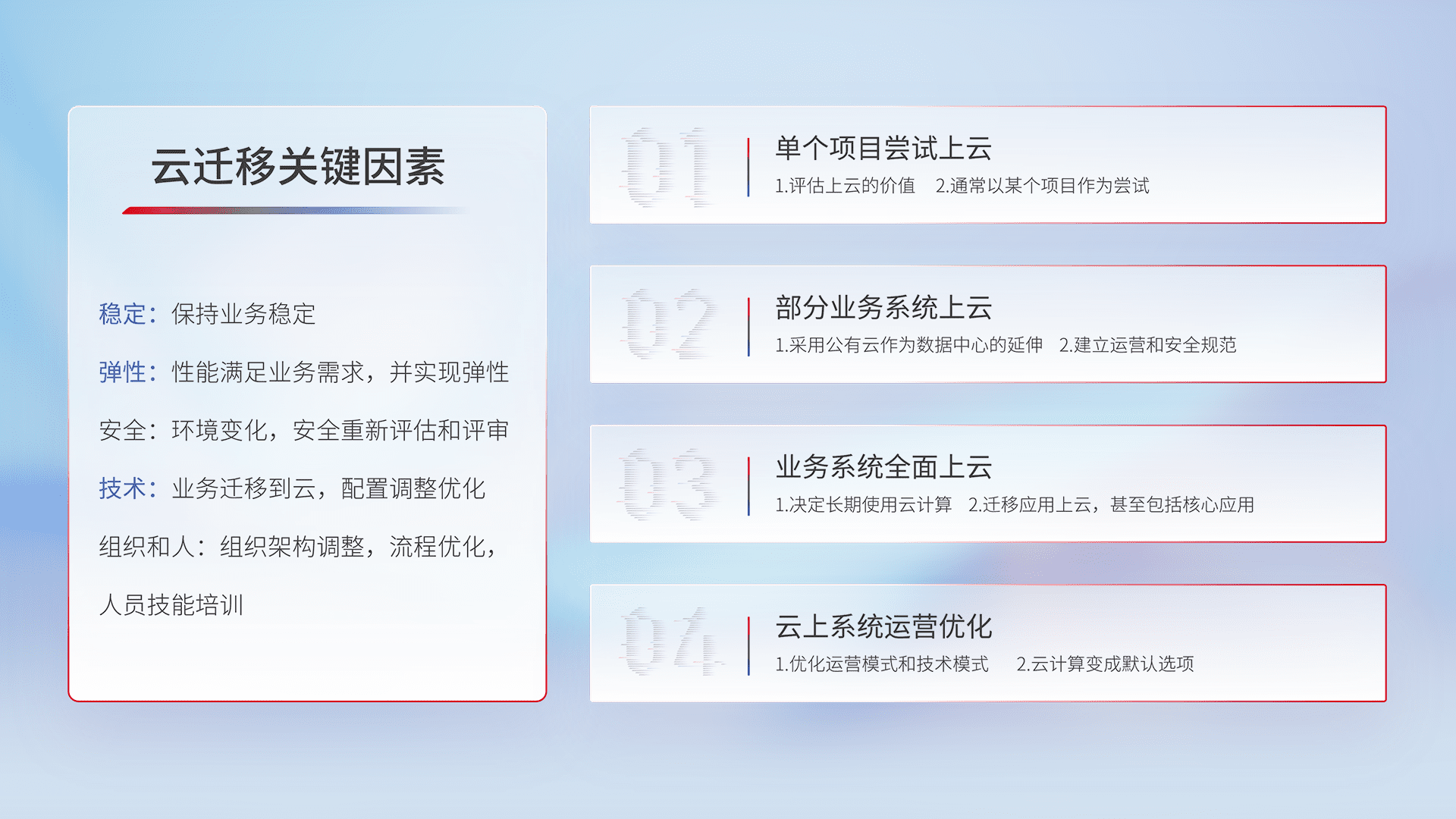 结合实际业务,,,,从规划设计、、云平台选型、、、、云原生改造、、数据迁移、、集成交付,,,,迁移全过程为客户识别最佳上云路径,,做好风险识别管理,,设计网络架构、、、、身份权限、、、安全审计合规、、操作审计、、日志审计、、、监控告警策略、、、多站点容灾设计等,,,对云上基础设施进行整体规划,,,,提升IT治理水平,,以满足弹性、、高可用、、、、高性能的需求。。。