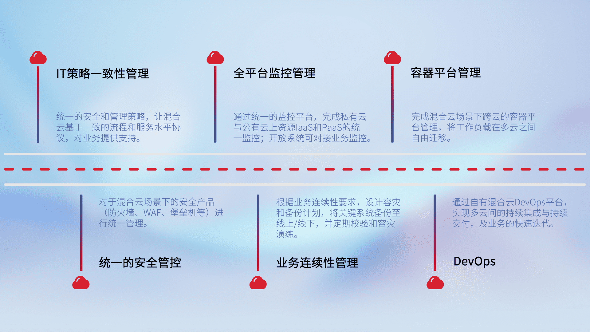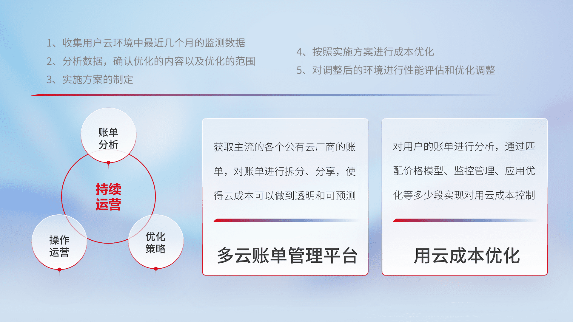 通过多云纳管,,,以统一的资源数据模型把客户的云资源进行抽象和封装,,进而实现对多云资源的统一操作,,,,保障云资源管理的可靠性、、、稳定性与可用性。。量身定制化运维内容,,配置、、、开发运维、、、补丁管理、、备份、、、监控、、认证和访问管理、、、审计和日常巡检等,,保障在用云过程中的可靠度,,,稳定度以及高可用率。。